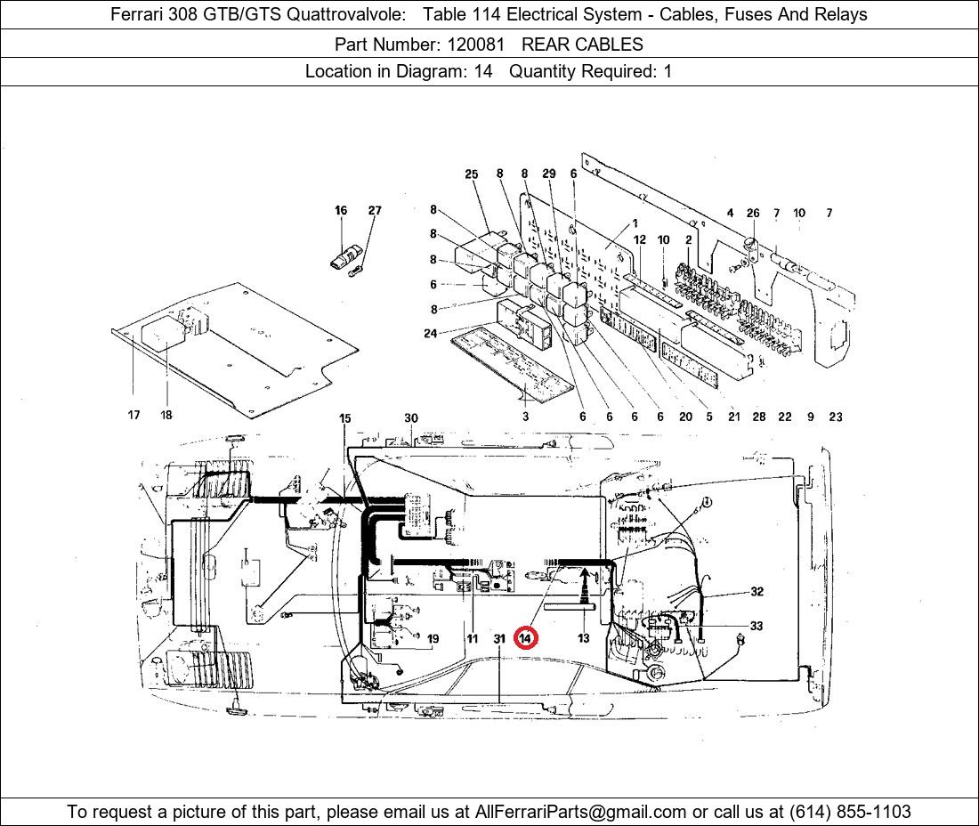 Ferrari Part Number 120081, REAR CABLES shown here as used in Ferrari 308 GTB/GTS Quattrovalvole Table 114 Electrical System - Cables, Fuses And Relays. Location in Diagram: 14. Required Quantity: 1