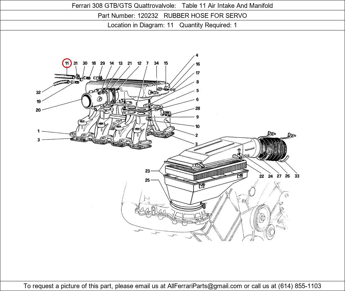 Ferrari Part Number 120232, RUBBER HOSE FOR SERVO shown here as used in Ferrari 308 GTB/GTS Quattrovalvole Table 11 Air Intake And Manifold. Location in Diagram: 11. Required Quantity: 1. This Ferrari part is used in more than one diagram. Click on the diagrams below to see alternative uses of this part: