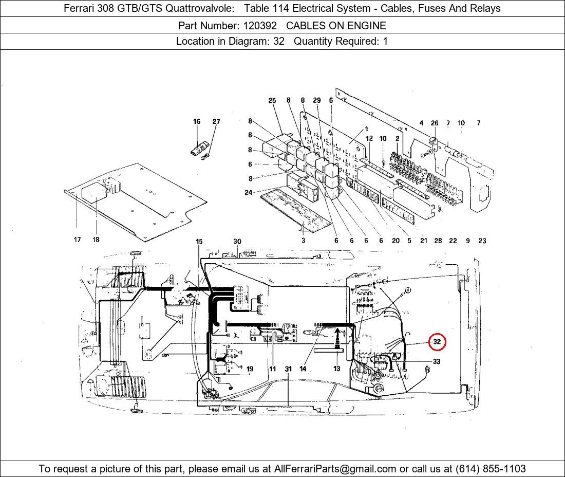 Ferrari Part Number 120392, CABLES ON ENGINE shown here as used in Ferrari 308 GTB/GTS Quattrovalvole Table 114 Electrical System - Cables, Fuses And Relays. Location in Diagram: 32. Required Quantity: 1