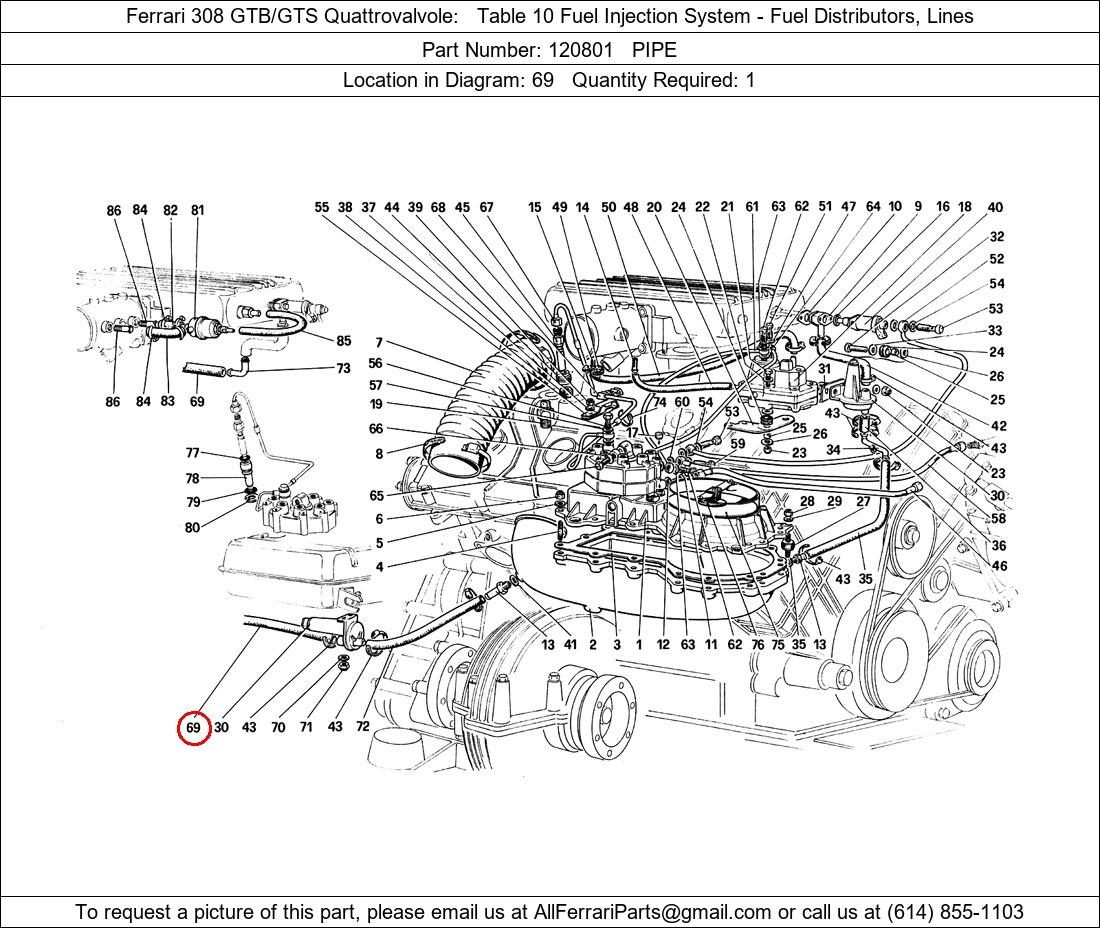 Ferrari Part Number 120801, PIPE shown here as used in Ferrari 308 GTB/GTS Quattrovalvole Table 10 Fuel Injection System - Fuel Distributors, Lines. Location in Diagram: 69. Required Quantity: 1. This Ferrari part is used in more than one diagram. Click on the diagrams below to see alternative uses of this part: