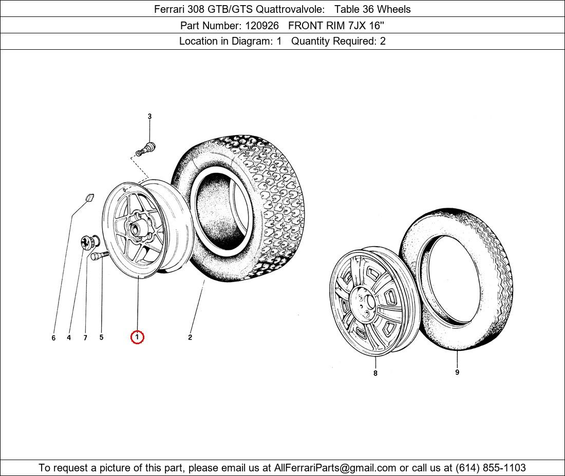 Ferrari Part Number 120926, FRONT RIM 7JX 16'' shown here as used in Ferrari 308 GTB/GTS Quattrovalvole Table 36 Wheels. Location in Diagram: 1. Required Quantity: 2