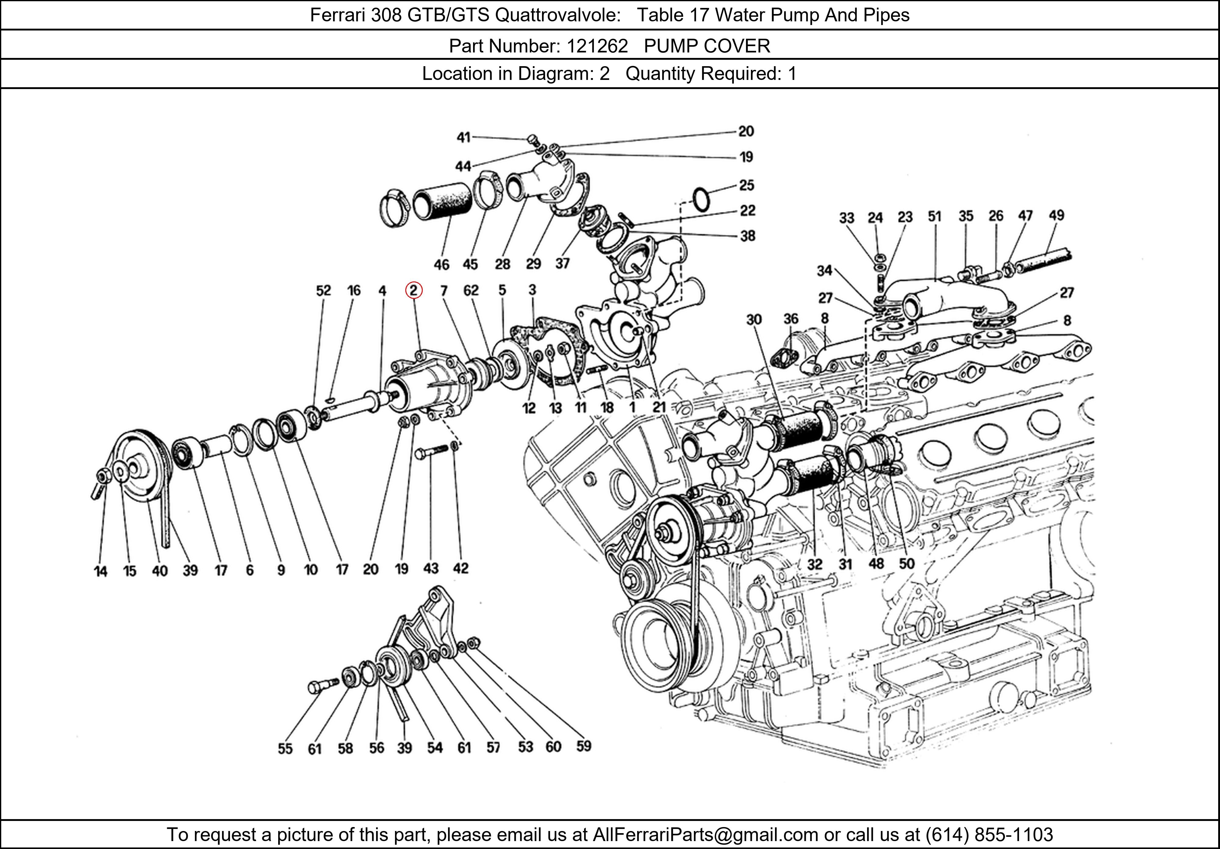 Ferrari Part Number 121262, PUMP COVER shown here as used in Ferrari 308 GTB/GTS Quattrovalvole Table 17 Water Pump And Pipes. Location in Diagram: 2. Required Quantity: 1. This Ferrari part is used in more than one diagram. Click on the diagrams below to see alternative uses of this part: