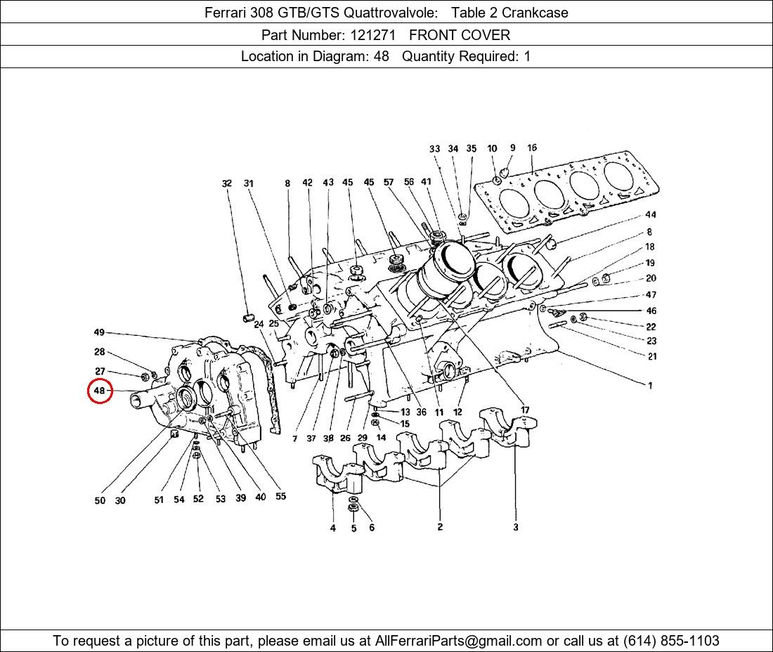 Ferrari Part Number 121271, FRONT COVER shown here as used in Ferrari 308 GTB/GTS Quattrovalvole Table 2 Crankcase. Location in Diagram: 48. Required Quantity: 1. This Ferrari part is used in more than one diagram. Click on the diagrams below to see alternative uses of this part: