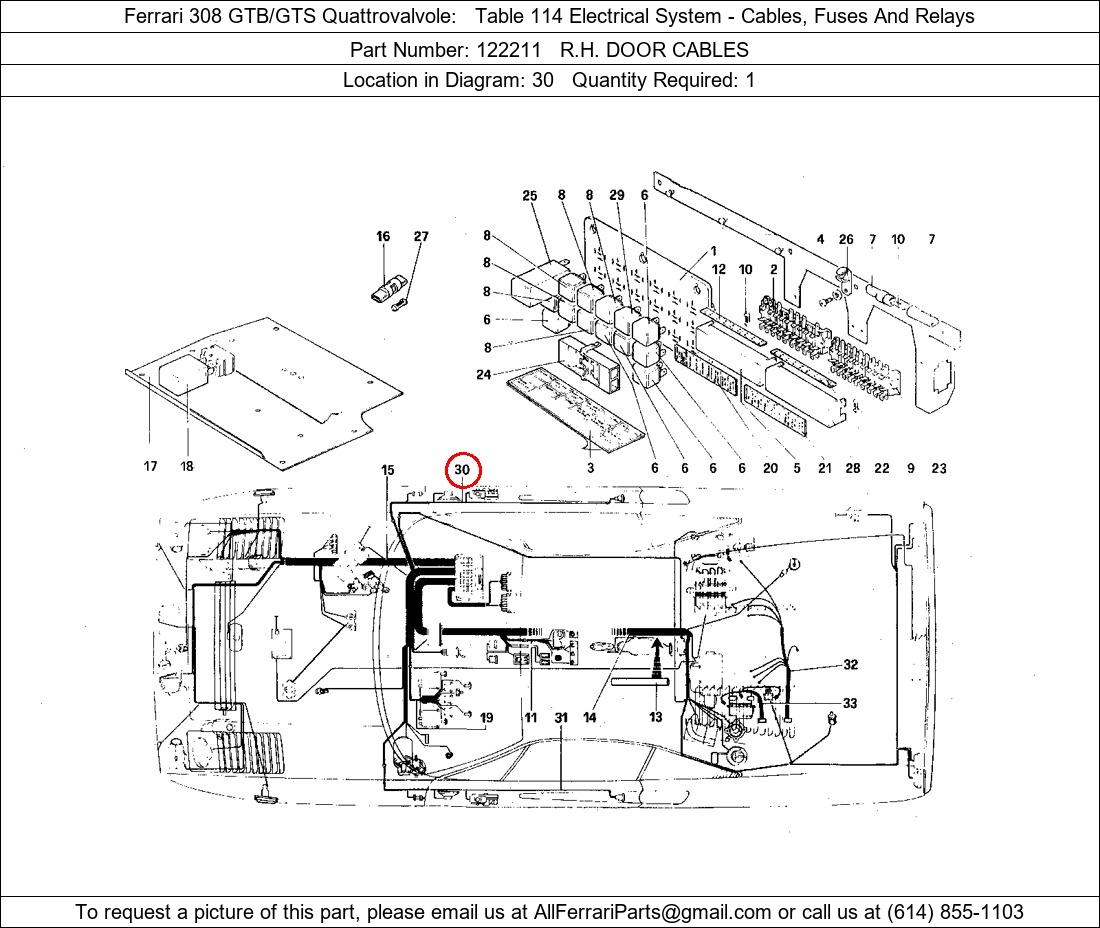 Ferrari Part Number 122211, R.H. DOOR CABLES shown here as used in Ferrari 308 GTB/GTS Quattrovalvole Table 114 Electrical System - Cables, Fuses And Relays. Location in Diagram: 30. Required Quantity: 1