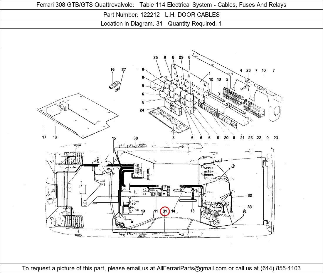 Ferrari Part Number 122212, L.H. DOOR CABLES shown here as used in Ferrari 308 GTB/GTS Quattrovalvole Table 114 Electrical System - Cables, Fuses And Relays. Location in Diagram: 31. Required Quantity: 1