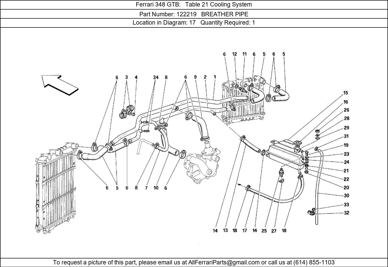 Ferrari Part 122219, BREATHER PIPE, shown here as used in Ferrari 348 GTB Table 21 Cooling System. Other uses of this part are shown below: