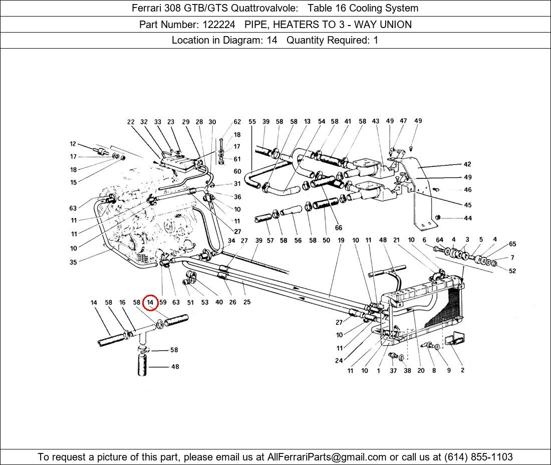 Ferrari Part Number 122224, PIPE, HEATERS TO 3 - WAY UNION shown here as used in Ferrari 308 GTB/GTS Quattrovalvole Table 16 Cooling System. Location in Diagram: 14. Required Quantity: 1