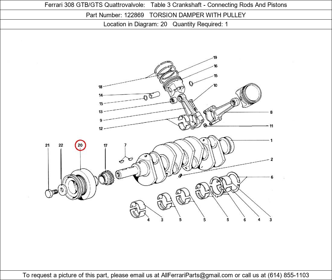 Ferrari Part Number 122869, TORSION DAMPER WITH PULLEY shown here as used in Ferrari 308 GTB/GTS Quattrovalvole Table 3 Crankshaft - Connecting Rods And Pistons. Location in Diagram: 20. Required Quantity: 1. This Ferrari part is used in more than one diagram. Click on the diagrams below to see alternative uses of this part: