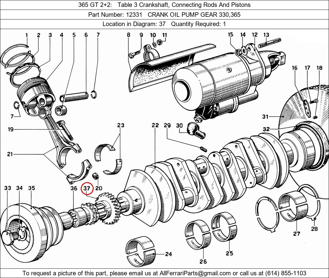 Ferrari Part Number 12331, CRANK OIL PUMP GEAR 330,365 shown here as used in 365 GT 2+2 Table 3 Crankshaft, Connecting Rods And Pistons. Location in Diagram: 37. Required Quantity: 1. This Ferrari part is used in more than one diagram. Click on the diagrams below to see alternative uses of this part: