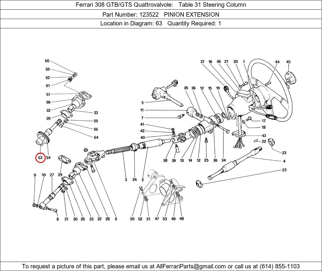 Ferrari Part Number 123522, PINION EXTENSION shown here as used in Ferrari 308 GTB/GTS Quattrovalvole Table 31 Steering Column. Location in Diagram: 63. Required Quantity: 1. This Ferrari part is used in more than one diagram. Click on the diagrams below to see alternative uses of this part: