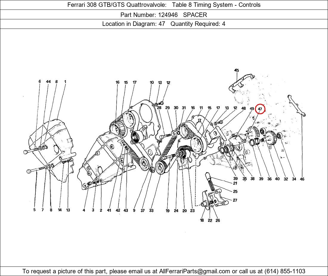 Ferrari Part Number 124946, SPACER shown here as used in Ferrari 308 GTB/GTS Quattrovalvole Table 8 Timing System - Controls. Location in Diagram: 47. Required Quantity: 4. This Ferrari part is used in more than one diagram. Click on the diagrams below to see alternative uses of this part: