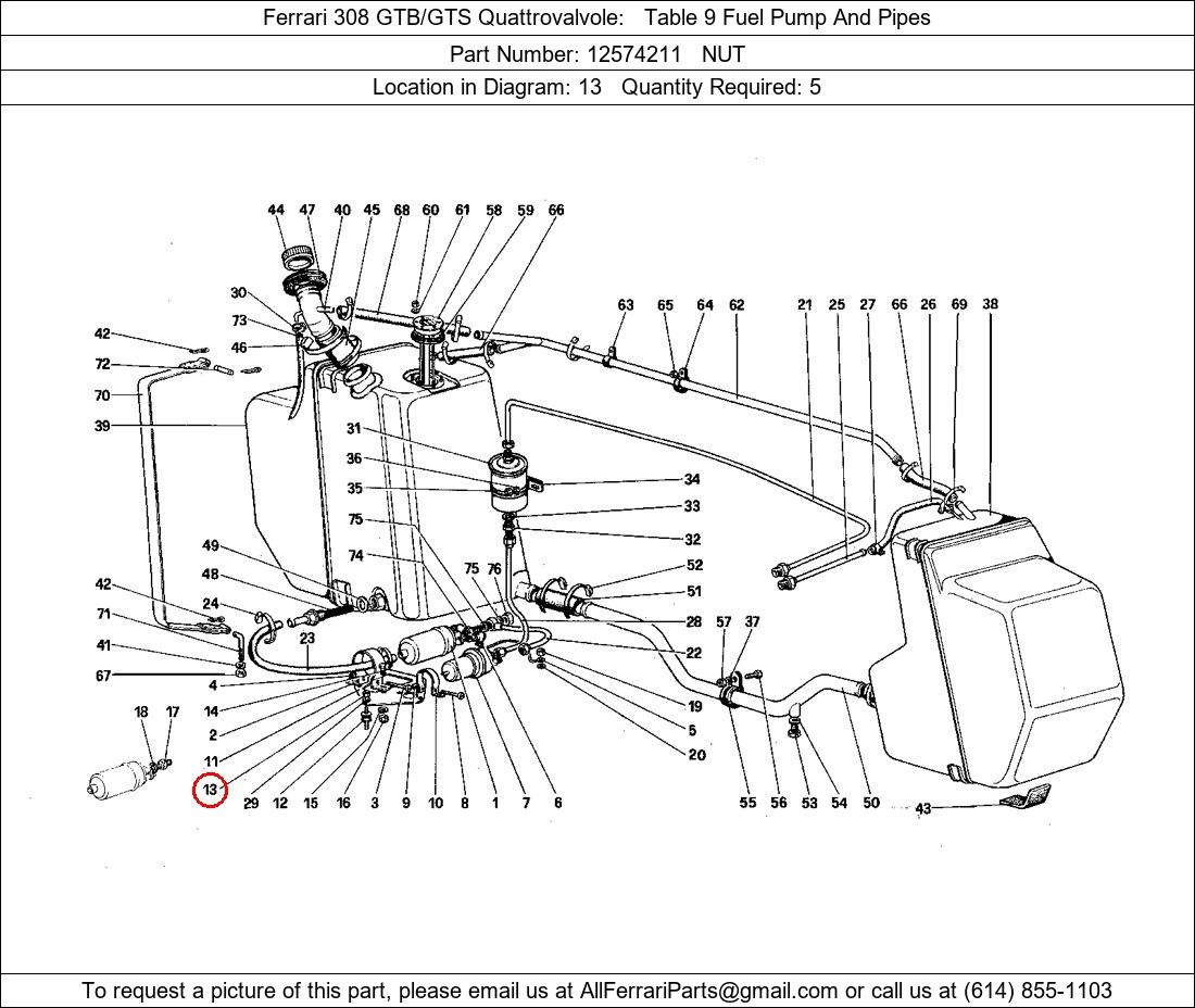 Ferrari Part Number 12574211, NUT shown here as used in Ferrari 308 GTB/GTS Quattrovalvole Table 9 Fuel Pump And Pipes. Location in Diagram: 13. Required Quantity: 5. This Ferrari part is used in more than one diagram. Click on the diagrams below to see alternative uses of this part: