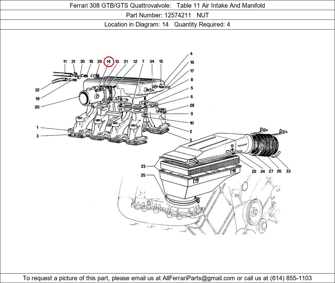Ferrari Part Number 12574211, NUT shown here as used in Ferrari 308 GTB/GTS Quattrovalvole Table 11 Air Intake And Manifold. Location in Diagram: 14. Required Quantity: 4. This Ferrari part is used in more than one diagram. Click on the diagrams below to see alternative uses of this part: