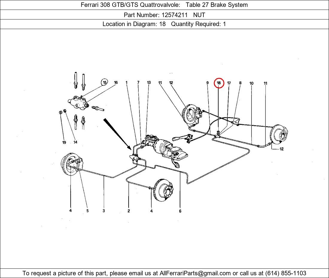 Ferrari Part Number 12574211, NUT shown here as used in Ferrari 308 GTB/GTS Quattrovalvole Table 27 Brake System. Location in Diagram: 18. Required Quantity: 1. This Ferrari part is used in more than one diagram. Click on the diagrams below to see alternative uses of this part: