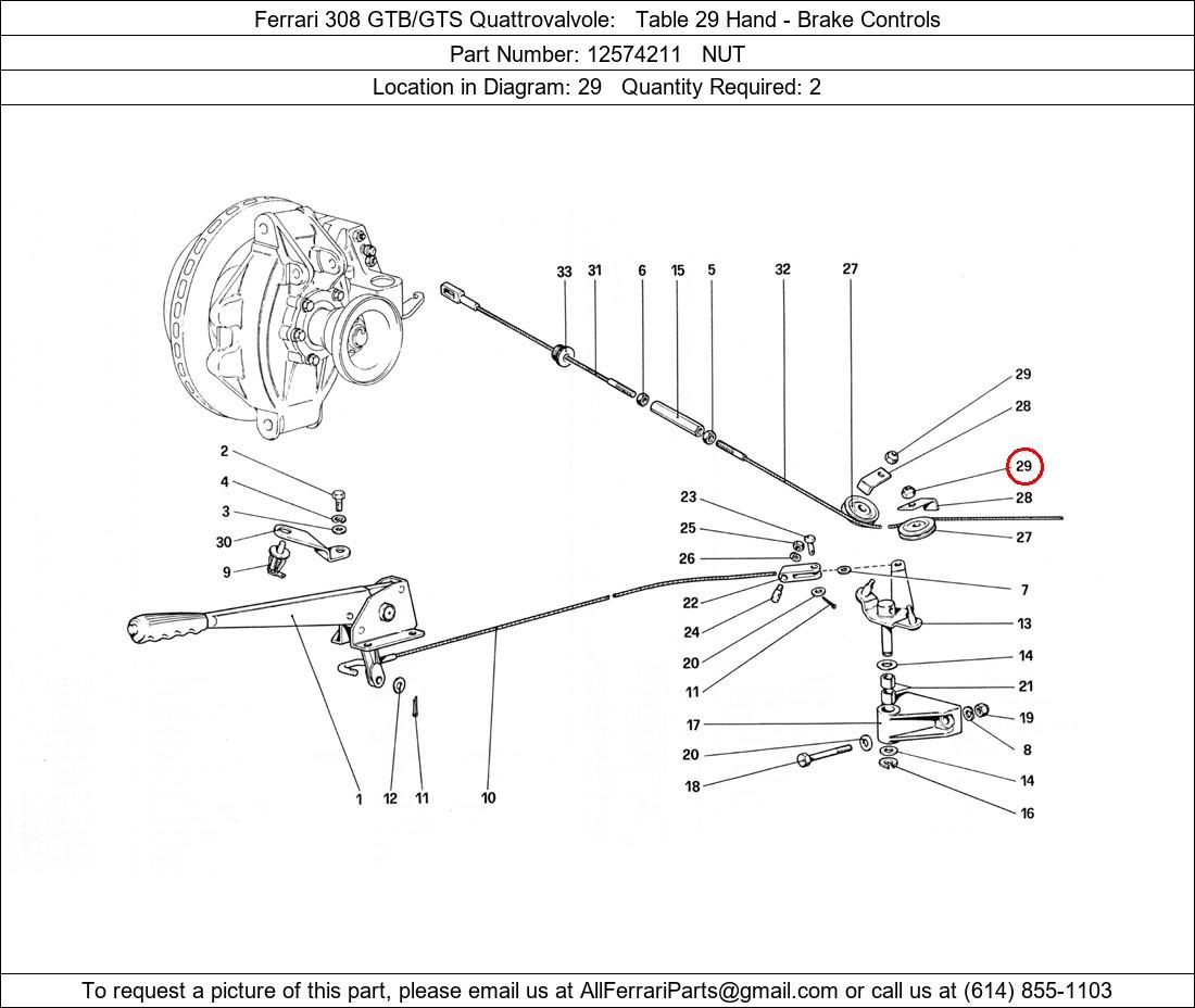 Ferrari Part Number 12574211, NUT shown here as used in Ferrari 308 GTB/GTS Quattrovalvole Table 29 Hand - Brake Controls. Location in Diagram: 29. Required Quantity: 2. This Ferrari part is used in more than one diagram. Click on the diagrams below to see alternative uses of this part: