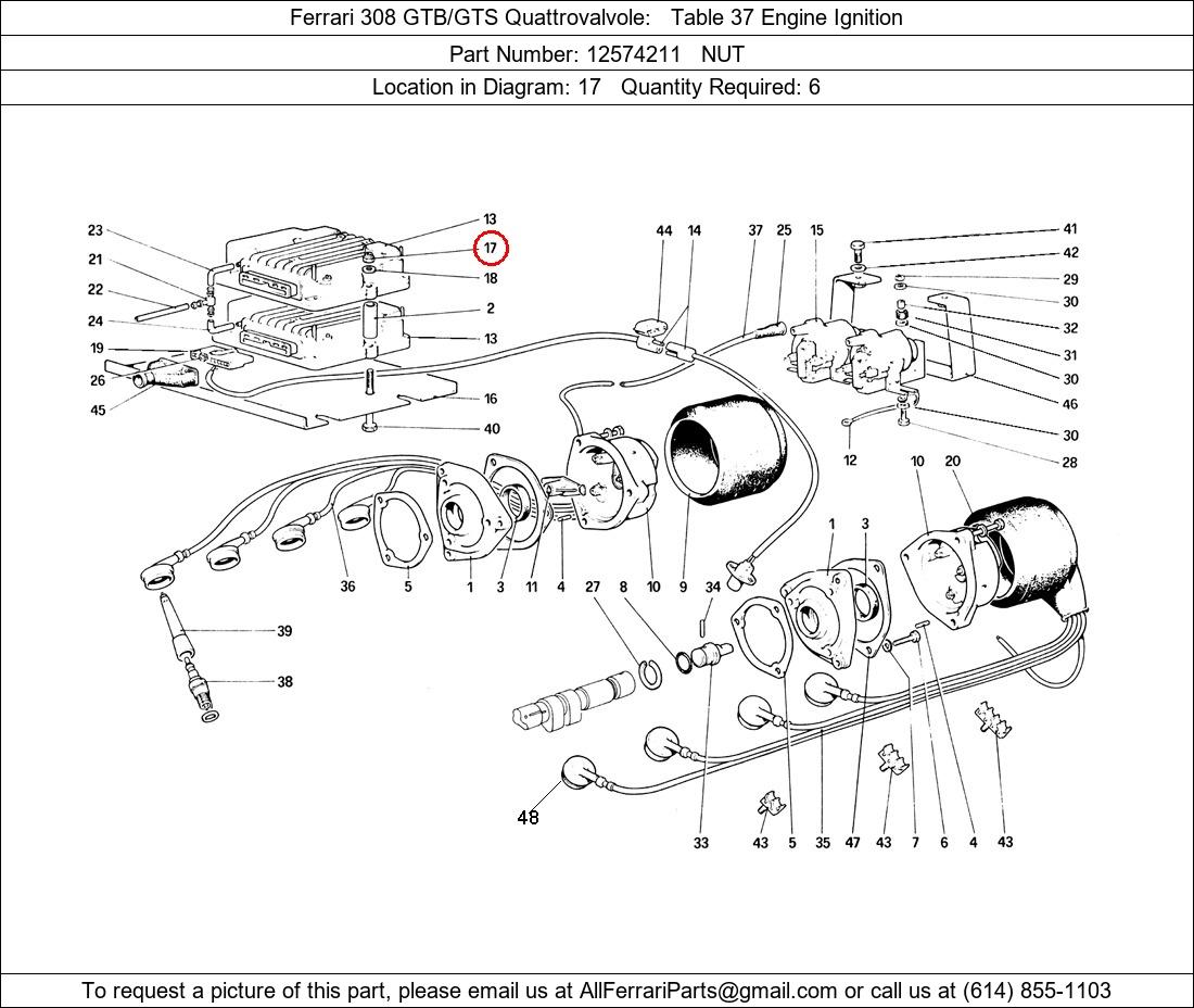Ferrari Part Number 12574211, NUT shown here as used in Ferrari 308 GTB/GTS Quattrovalvole Table 37 Engine Ignition. Location in Diagram: 17. Required Quantity: 6. This Ferrari part is used in more than one diagram. Click on the diagrams below to see alternative uses of this part: