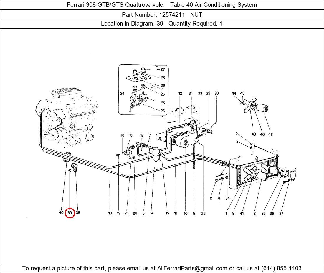 Ferrari Part Number 12574211, NUT shown here as used in Ferrari 308 GTB/GTS Quattrovalvole Table 40 Air Conditioning System. Location in Diagram: 39. Required Quantity: 1. This Ferrari part is used in more than one diagram. Click on the diagrams below to see alternative uses of this part: