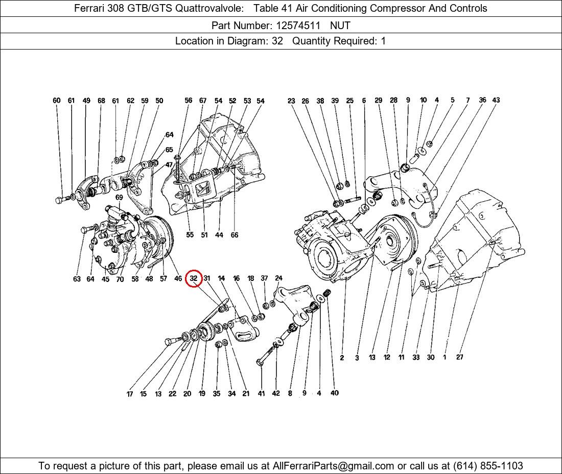 Ferrari Part Number 12574511, NUT shown here as used in Ferrari 308 GTB/GTS Quattrovalvole Table 41 Air Conditioning Compressor And Controls. Location in Diagram: 32. Required Quantity: 1. This Ferrari part is used in more than one diagram. Click on the diagrams below to see alternative uses of this part: