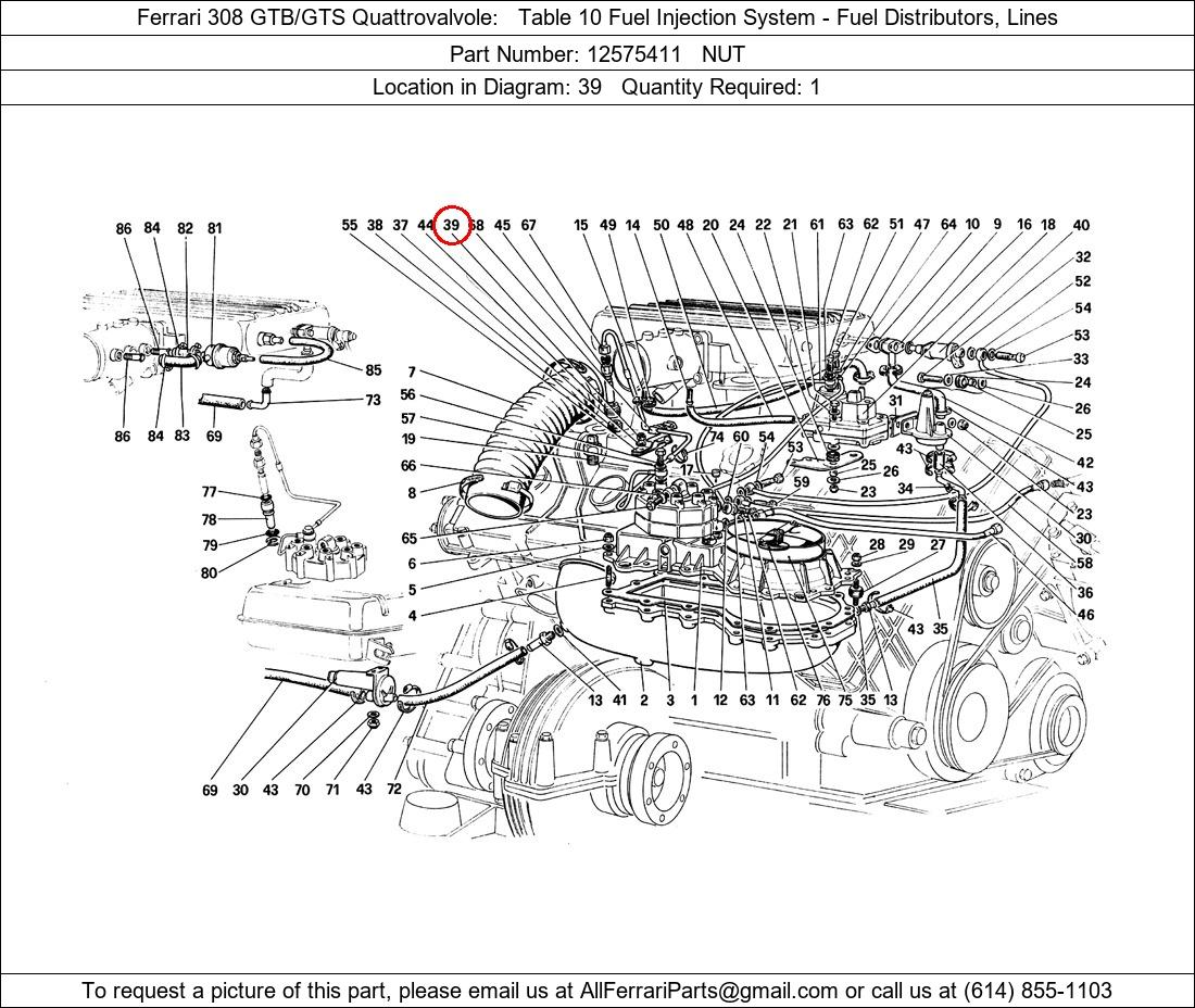 Ferrari Part Number 12575411, NUT shown here as used in Ferrari 308 GTB/GTS Quattrovalvole Table 10 Fuel Injection System - Fuel Distributors, Lines. Location in Diagram: 39. Required Quantity: 1. This Ferrari part is used in more than one diagram. Click on the diagrams below to see alternative uses of this part: