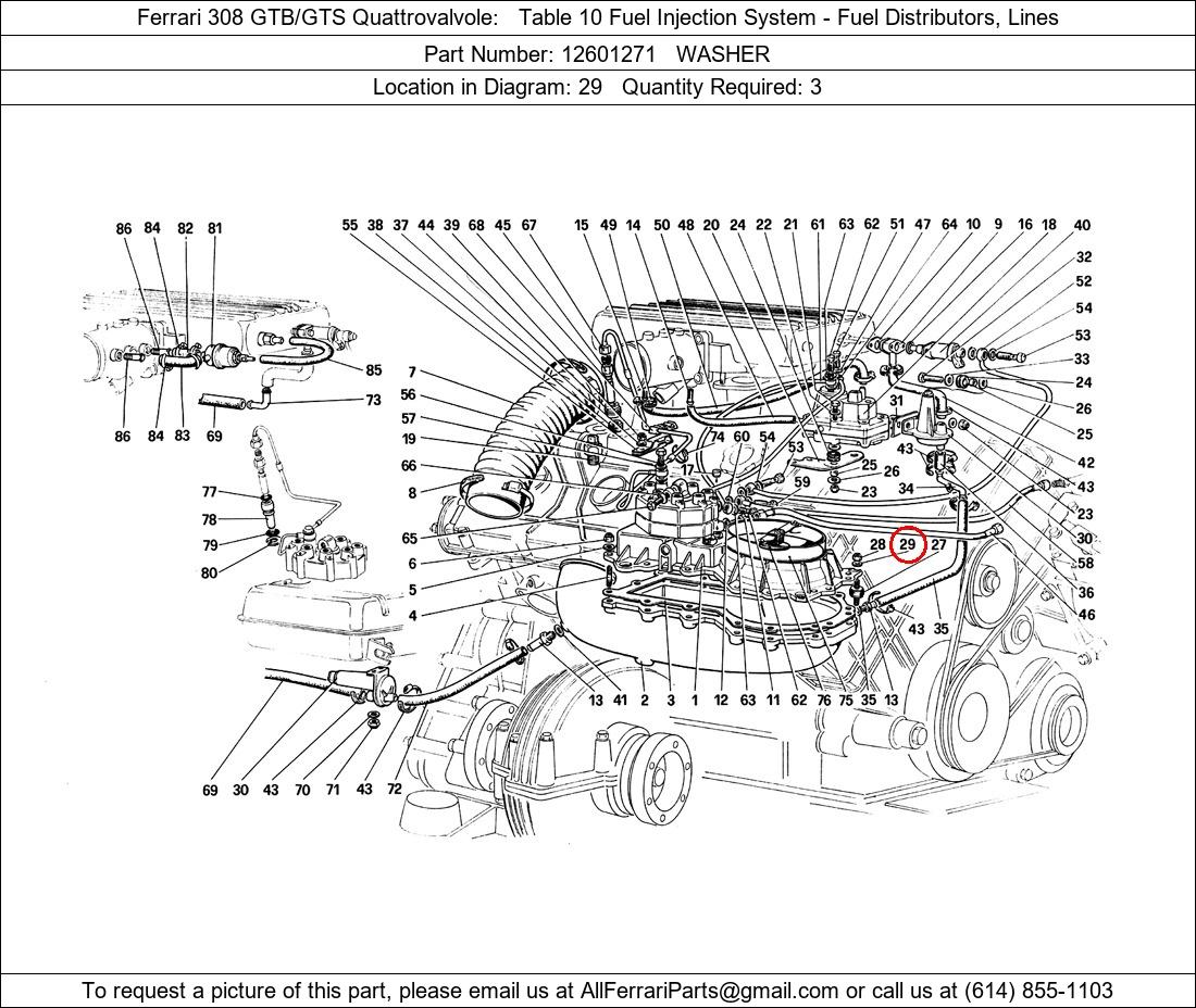 Ferrari Part Number 12601271, WASHER shown here as used in Ferrari 308 GTB/GTS Quattrovalvole Table 10 Fuel Injection System - Fuel Distributors, Lines. Location in Diagram: 29. Required Quantity: 3. This Ferrari part is used in more than one diagram. Click on the diagrams below to see alternative uses of this part: