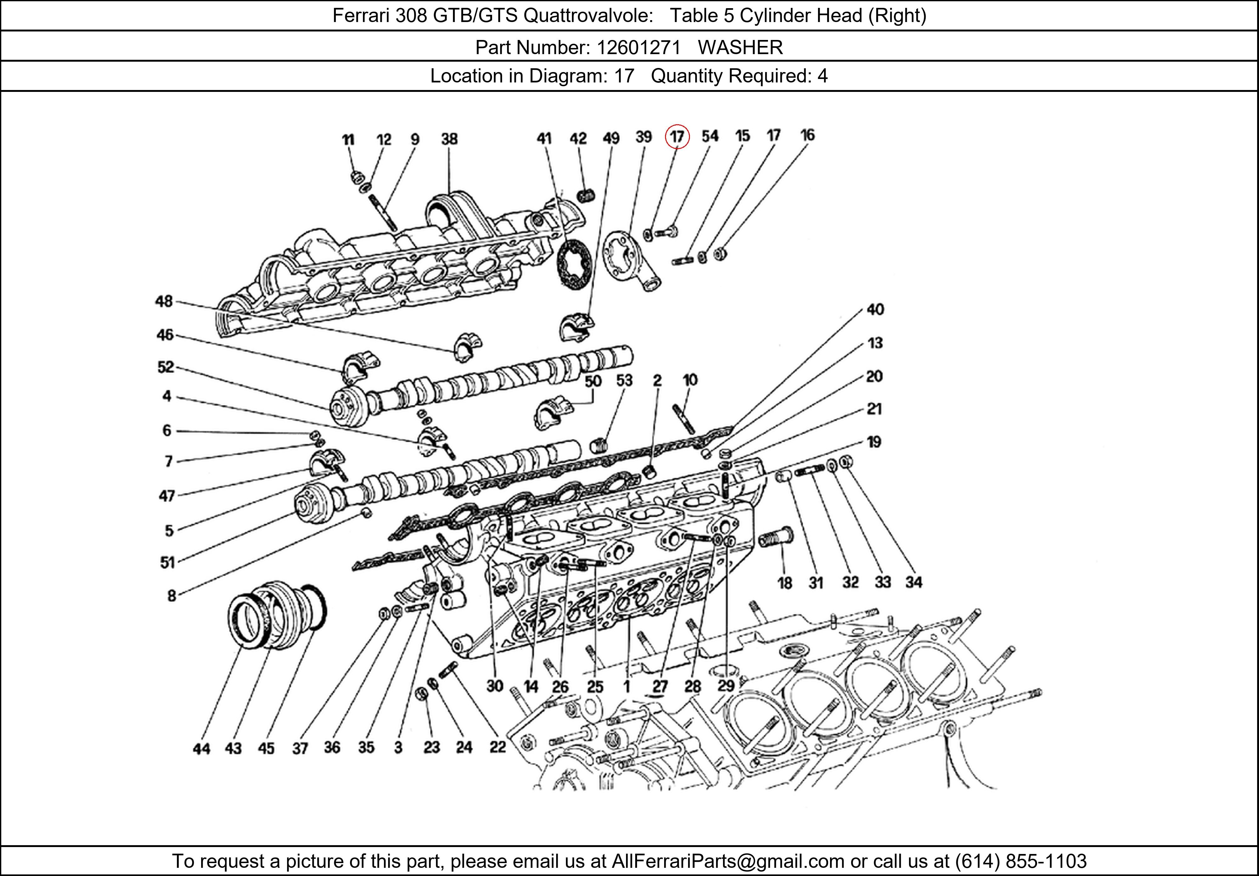 Ferrari Part Number 12601271, WASHER shown here as used in Ferrari 308 GTB/GTS Quattrovalvole Table 5 Cylinder Head (Right). Location in Diagram: 17. Required Quantity: 4. This Ferrari part is used in more than one diagram. Click on the diagrams below to see alternative uses of this part: