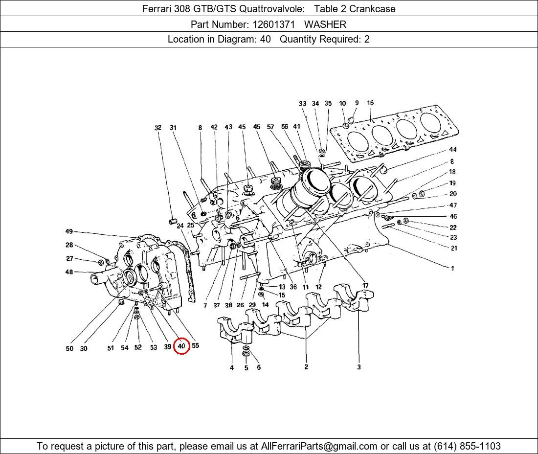 Ferrari Part Number 12601371, WASHER shown here as used in Ferrari 308 GTB/GTS Quattrovalvole Table 2 Crankcase. Location in Diagram: 40. Required Quantity: 2. This Ferrari part is used in more than one diagram. Click on the diagrams below to see alternative uses of this part:
