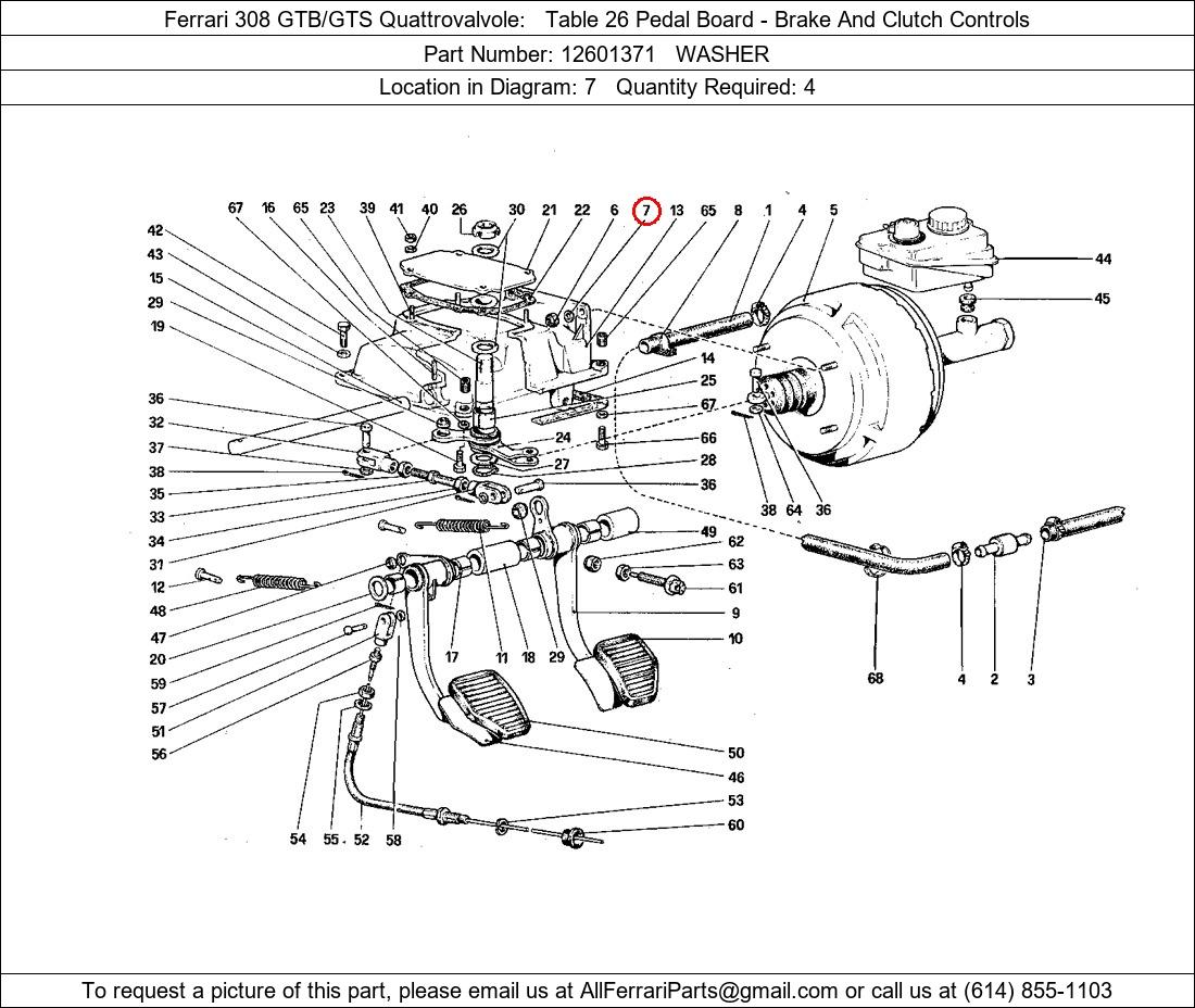 Ferrari Part Number 12601371, WASHER shown here as used in Ferrari 308 GTB/GTS Quattrovalvole Table 26 Pedal Board - Brake And Clutch Controls. Location in Diagram: 7. Required Quantity: 4. This Ferrari part is used in more than one diagram. Click on the diagrams below to see alternative uses of this part: