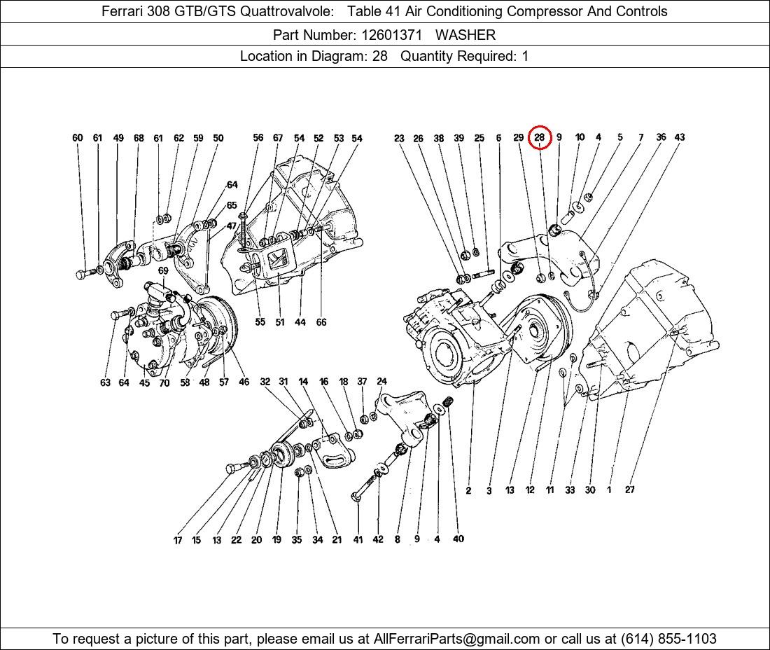 Ferrari Part Number 12601371, WASHER shown here as used in Ferrari 308 GTB/GTS Quattrovalvole Table 41 Air Conditioning Compressor And Controls. Location in Diagram: 28. Required Quantity: 1. This Ferrari part is used in more than one diagram. Click on the diagrams below to see alternative uses of this part: