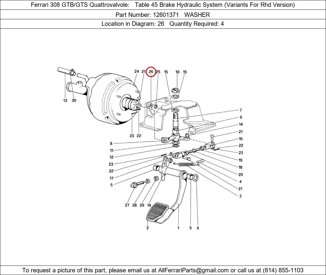Ferrari Part Number 12601371, WASHER shown here as used in Ferrari 308 GTB/GTS Quattrovalvole Table 45 Brake Hydraulic System (Variants For Rhd Version). Location in Diagram: 26. Required Quantity: 4. This Ferrari part is used in more than one diagram. Click on the diagrams below to see alternative uses of this part: