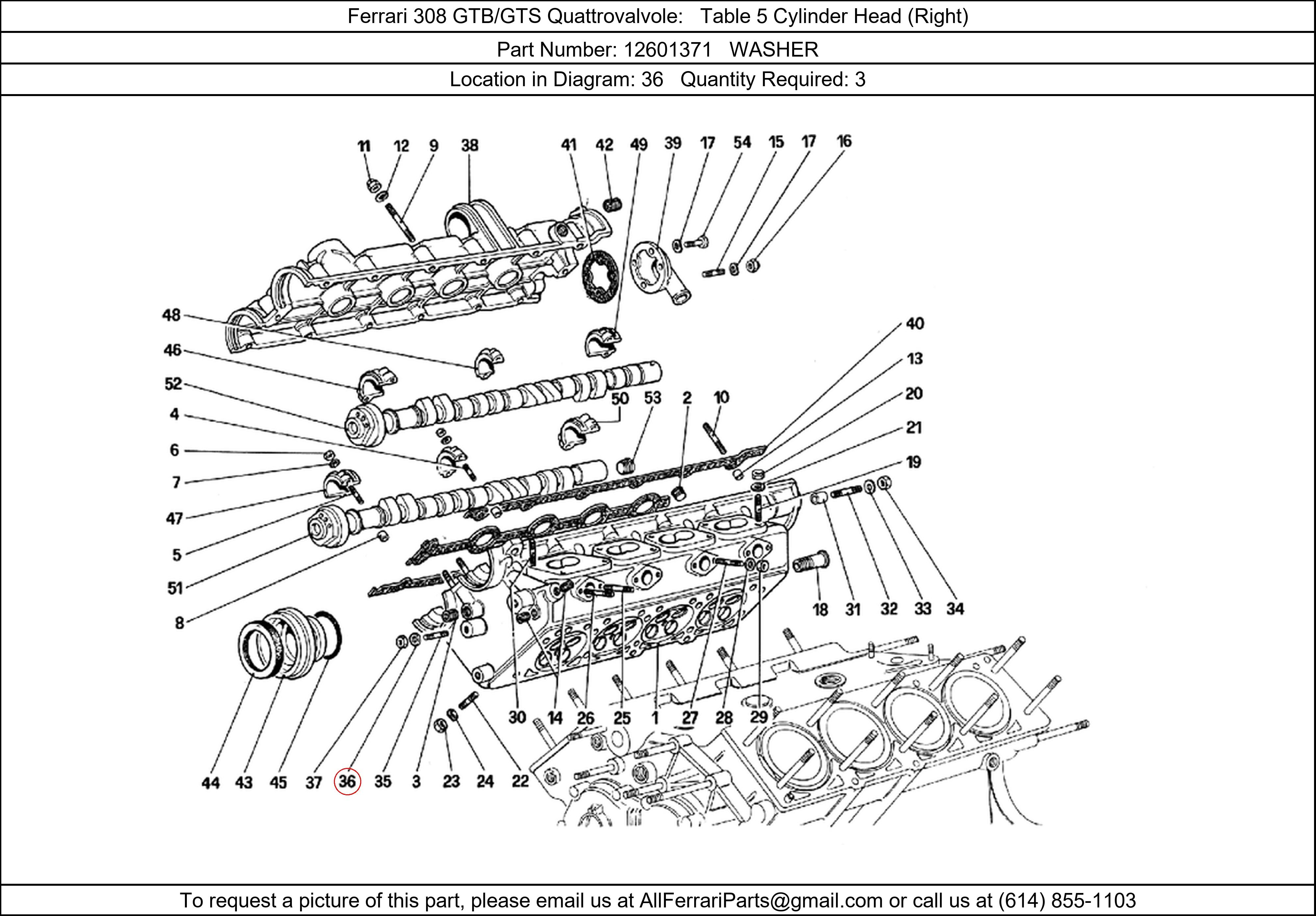 Ferrari Part Number 12601371, WASHER shown here as used in Ferrari 308 GTB/GTS Quattrovalvole Table 5 Cylinder Head (Right). Location in Diagram: 36. Required Quantity: 3. This Ferrari part is used in more than one diagram. Click on the diagrams below to see alternative uses of this part: