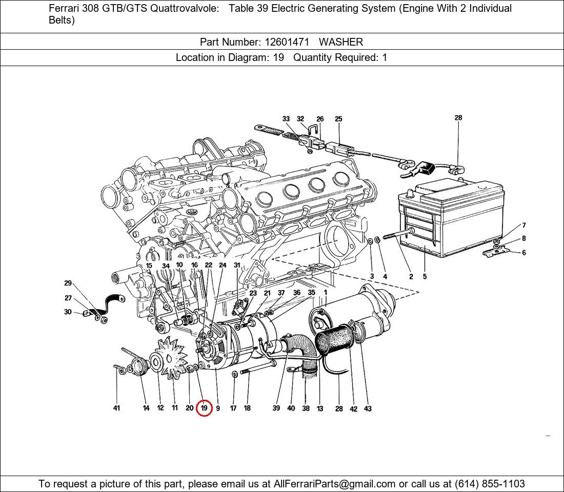 Ferrari Part Number 12601471, WASHER shown here as used in Ferrari 308 GTB/GTS Quattrovalvole Table 39 Electric Generating System (Engine With 2 Individual Belts). Location in Diagram: 19. Required Quantity: 1. This Ferrari part is used in more than one diagram. Click on the diagrams below to see alternative uses of this part: