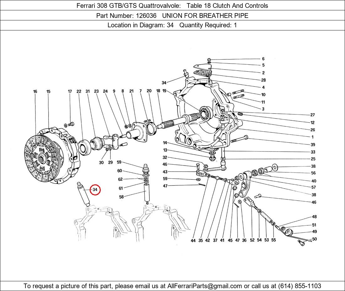 Ferrari Part Number 126036, UNION FOR BREATHER PIPE shown here as used in Ferrari 308 GTB/GTS Quattrovalvole Table 18 Clutch And Controls. Location in Diagram: 34. Required Quantity: 1