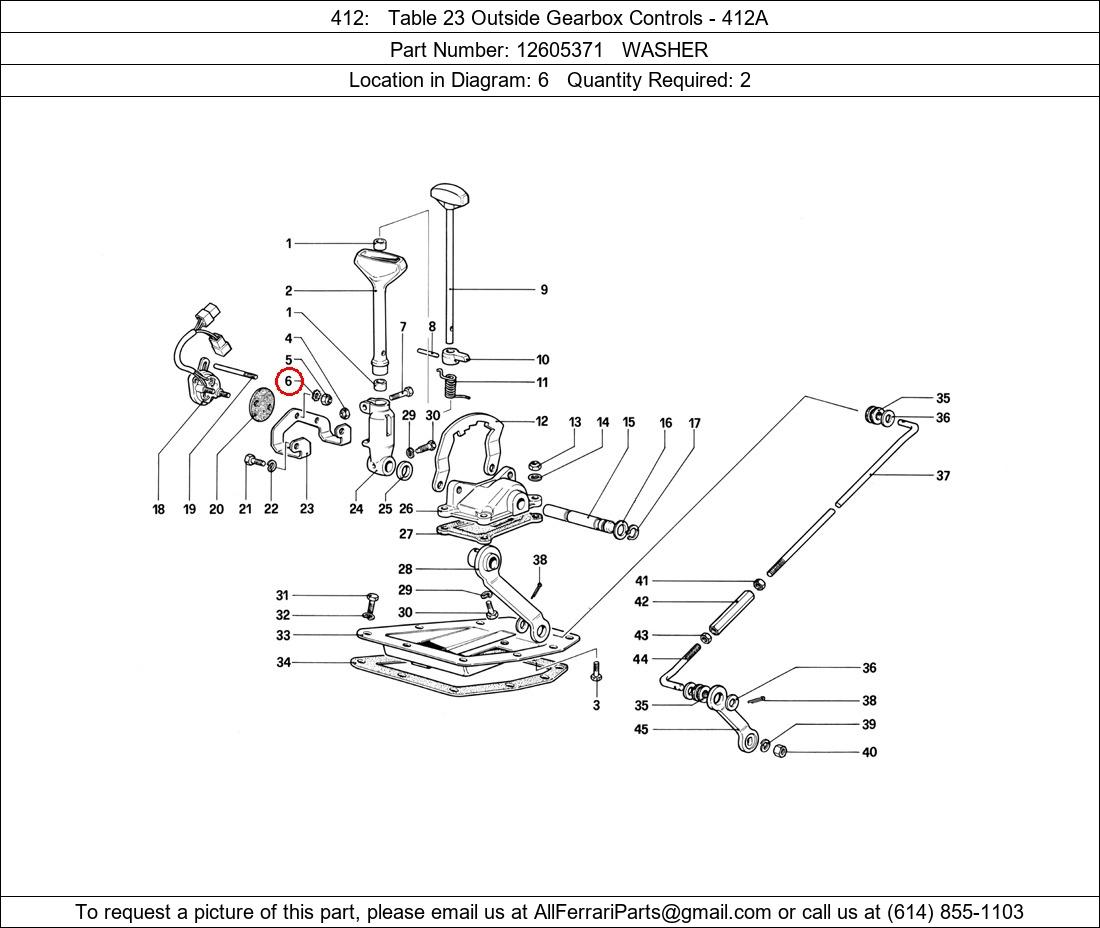 Ferrari Part Number 12605371, WASHER shown here as used in 412 Table 23 Outside Gearbox Controls - 412A. Location in Diagram: 6. Required Quantity: 2. This Ferrari part is used in more than one diagram. Click on the diagrams below to see alternative uses of this part: