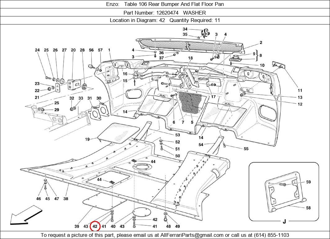 Ferrari Part Number 12620474, WASHER shown here as used in Enzo Table 106 Rear Bumper And Flat Floor Pan. Location in Diagram: 42. Required Quantity: 11. This Ferrari part is used in more than one diagram. Click on the diagrams below to see alternative uses of this part: