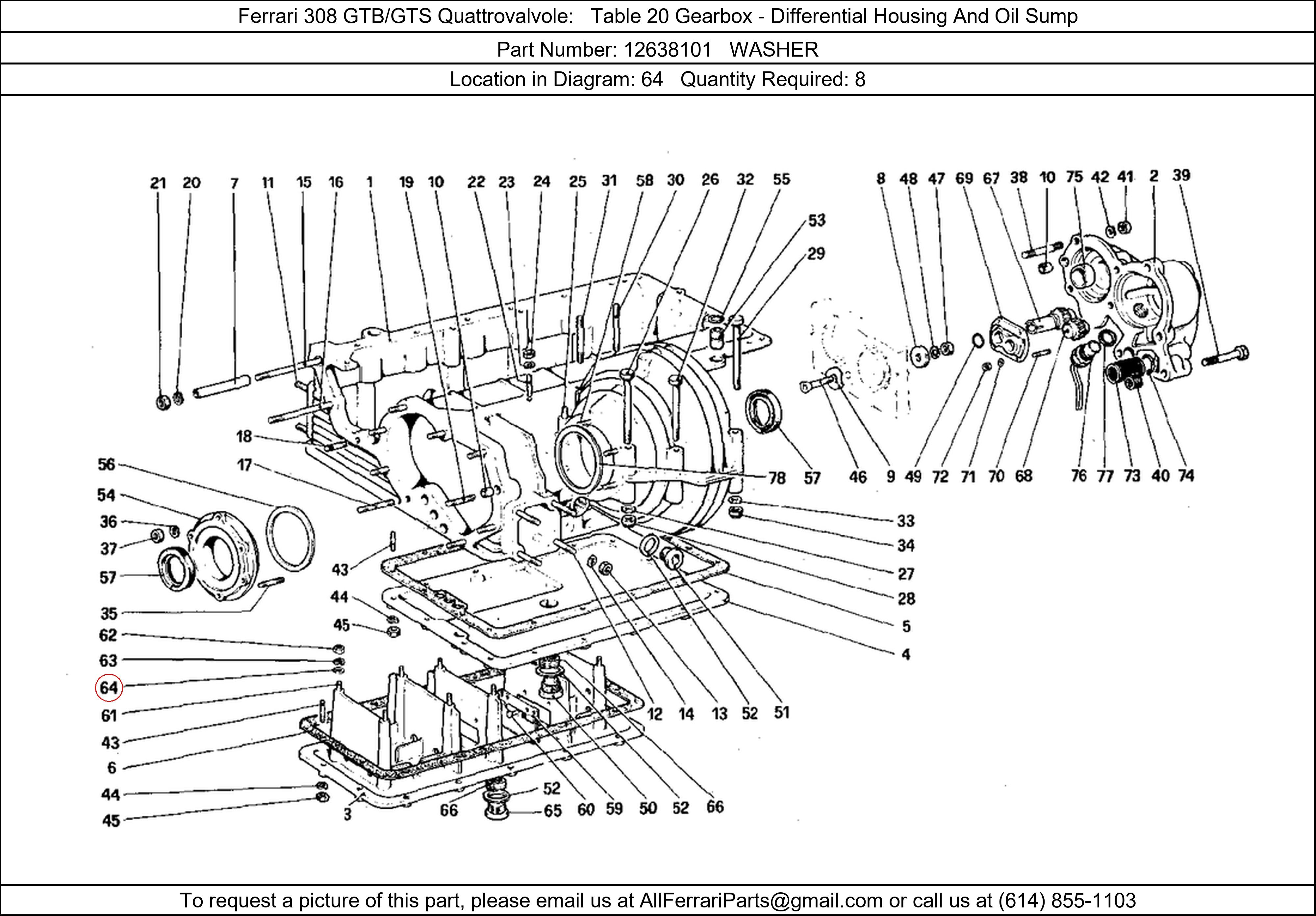 Ferrari Part Number 12638101, WASHER shown here as used in Ferrari 308 GTB/GTS Quattrovalvole Table 20 Gearbox - Differential Housing And Oil Sump. Location in Diagram: 64. Required Quantity: 8. This Ferrari part is used in more than one diagram. Click on the diagrams below to see alternative uses of this part: