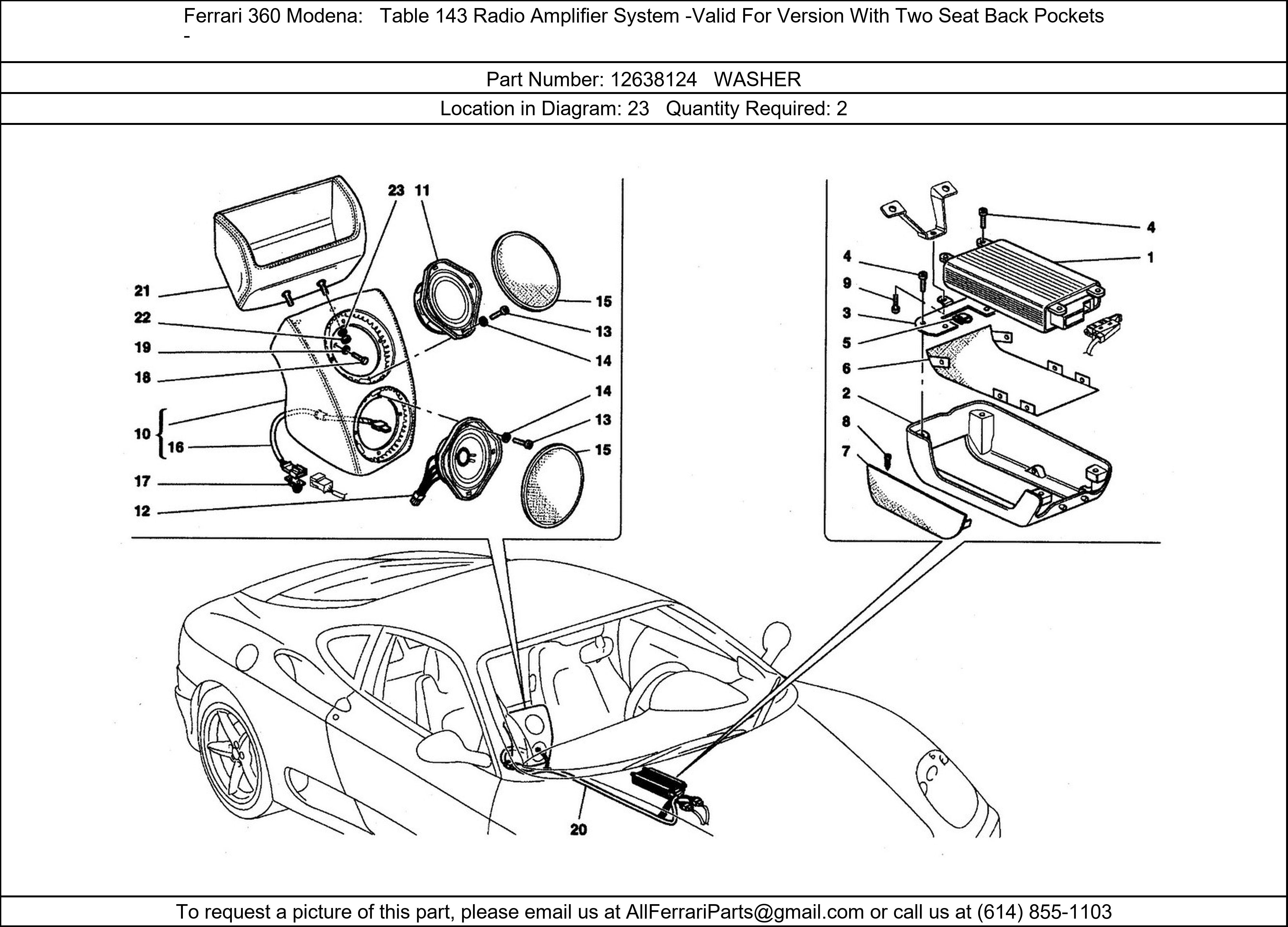 Ferrari Part 12638124, WASHER, shown here as used in Ferrari 360 Modena Table 143 Radio Amplifier System -Valid For Version With Two Seat Back Pockets-. Other uses of this part are shown below: