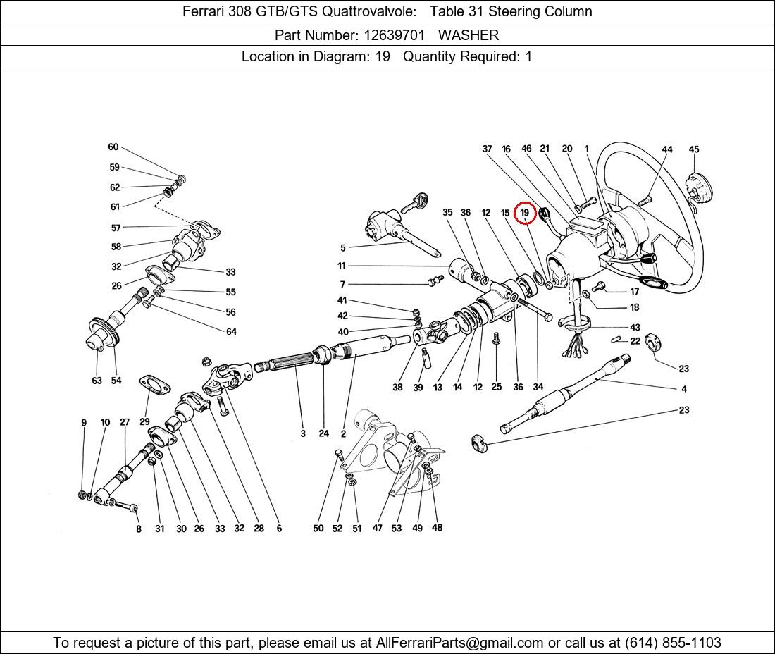 Ferrari Part Number 12639701, WASHER shown here as used in Ferrari 308 GTB/GTS Quattrovalvole Table 31 Steering Column. Location in Diagram: 19. Required Quantity: 1. This Ferrari part is used in more than one diagram. Click on the diagrams below to see alternative uses of this part: