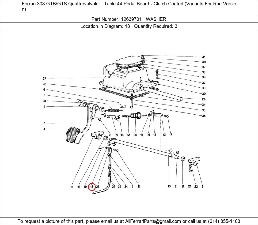 Ferrari Part Number 12639701, WASHER shown here as used in Ferrari 308 GTB/GTS Quattrovalvole Table 44 Pedal Board - Clutch Control (Variants For Rhd Version). Location in Diagram: 18. Required Quantity: 3. This Ferrari part is used in more than one diagram. Click on the diagrams below to see alternative uses of this part: