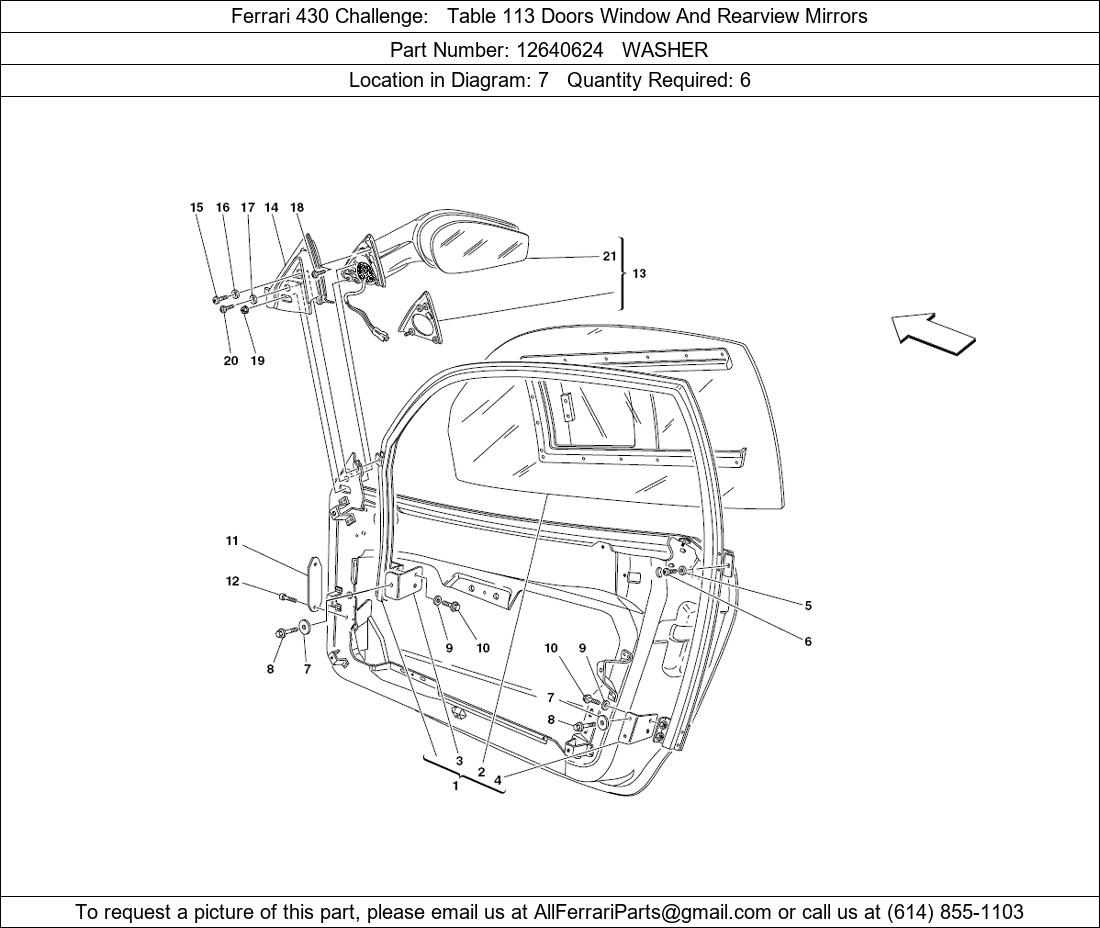 Ferrari Part 12640624, WASHER, shown here as used in Ferrari 430 Challenge Table 113 Doors Window And Rearview Mirrors. Other uses of this part are shown below: