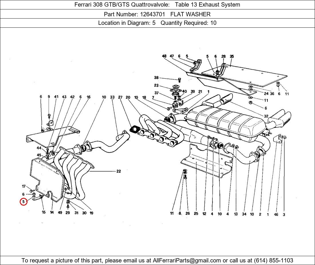Ferrari Part Number 12643701, FLAT WASHER shown here as used in Ferrari 308 GTB/GTS Quattrovalvole Table 13 Exhaust System. Location in Diagram: 5. Required Quantity: 10. This Ferrari part is used in more than one diagram. Click on the diagrams below to see alternative uses of this part: