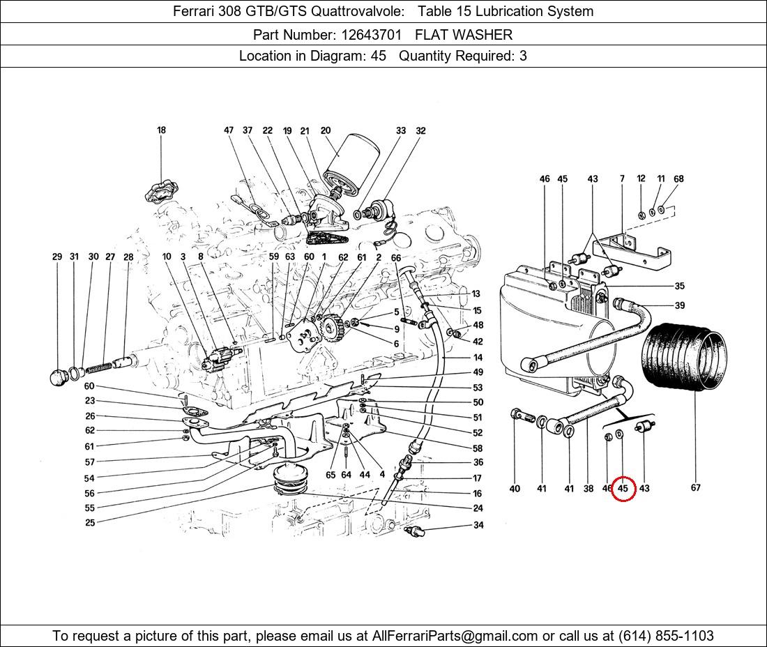 Ferrari Part Number 12643701, FLAT WASHER shown here as used in Ferrari 308 GTB/GTS Quattrovalvole Table 15 Lubrication System. Location in Diagram: 45. Required Quantity: 3. This Ferrari part is used in more than one diagram. Click on the diagrams below to see alternative uses of this part: