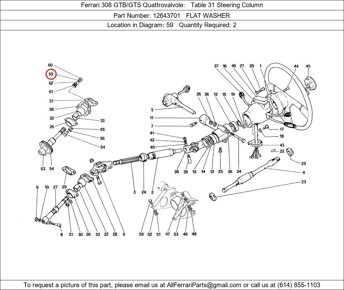 Ferrari Part Number 12643701, FLAT WASHER shown here as used in Ferrari 308 GTB/GTS Quattrovalvole Table 31 Steering Column. Location in Diagram: 59. Required Quantity: 2. This Ferrari part is used in more than one diagram. Click on the diagrams below to see alternative uses of this part: