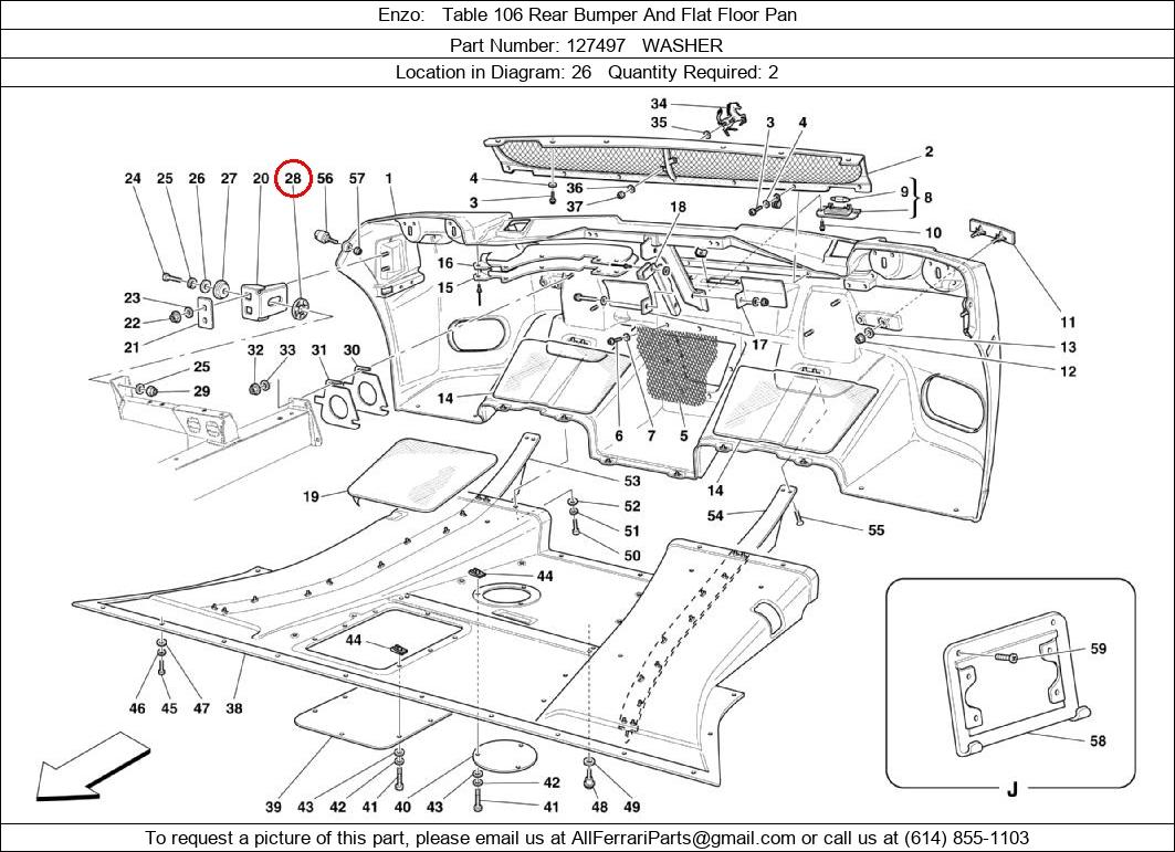 Ferrari Part Number 127497, WASHER shown here as used in Enzo Table 106 Rear Bumper And Flat Floor Pan. Location in Diagram: 26. Required Quantity: 2. This Ferrari part is used in more than one diagram. Click on the diagrams below to see alternative uses of this part: