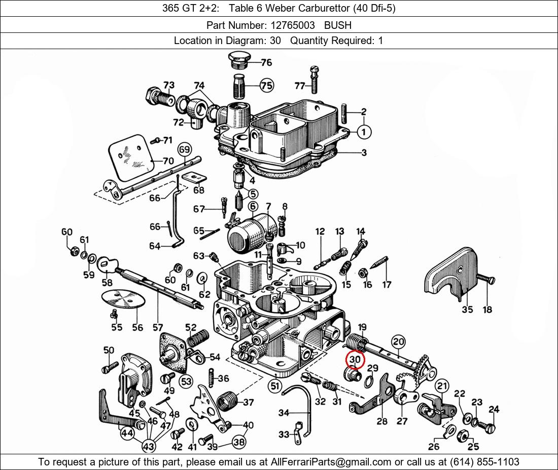 Ferrari Part Number 12765003, BUSH shown here as used in 365 GT 2+2 Table 6 Weber Carburettor (40 Dfi-5). Location in Diagram: 30. Required Quantity: 1