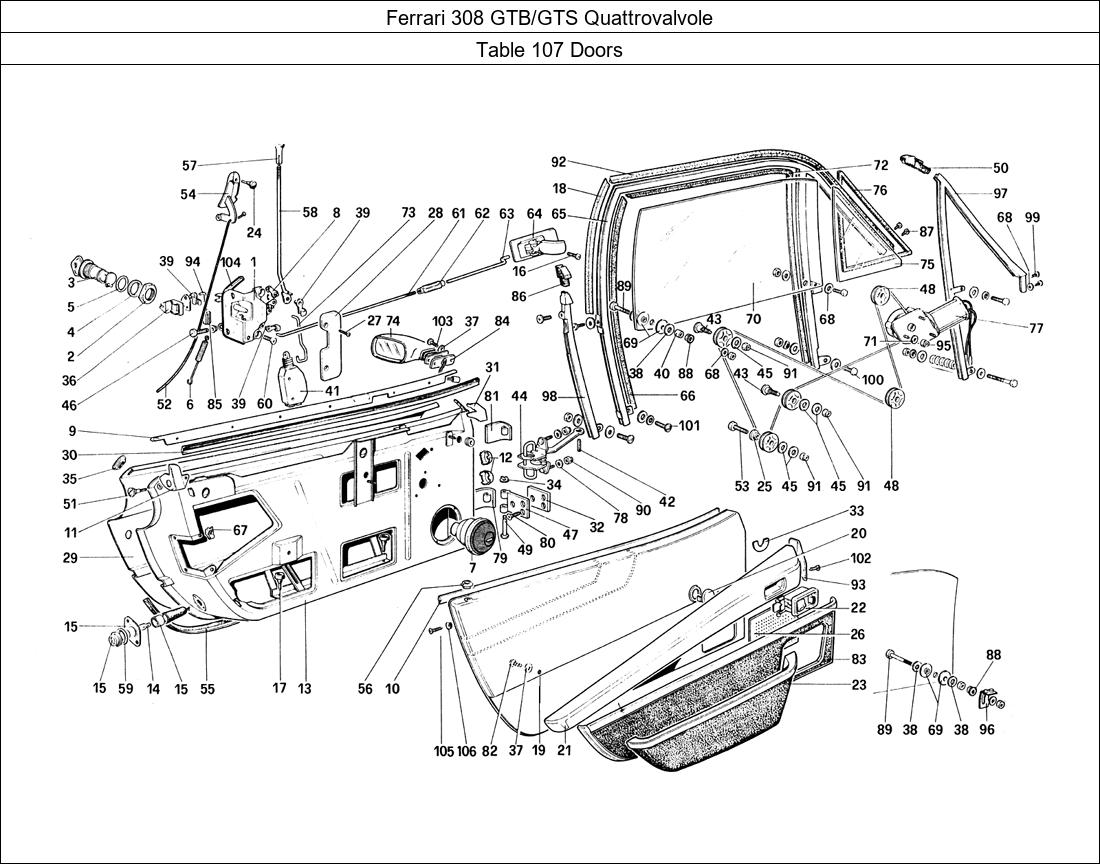 Ferrari Part Number 13274818, SCREW FOR ARMREST shown here as used in Ferrari 308 GTB/GTS Quattrovalvole Table 107 Doors. Location in Diagram: 82. Required Quantity: 2. This Ferrari part is used in more than one diagram. Click on the diagrams below to see alternative uses of this part: