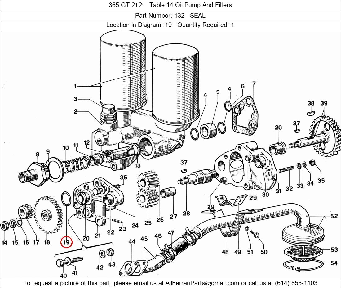 Ferrari Part Number 132, SEAL shown here as used in 365 GT 2+2 Table 14 Oil Pump And Filters. Location in Diagram: 19. Required Quantity: 1