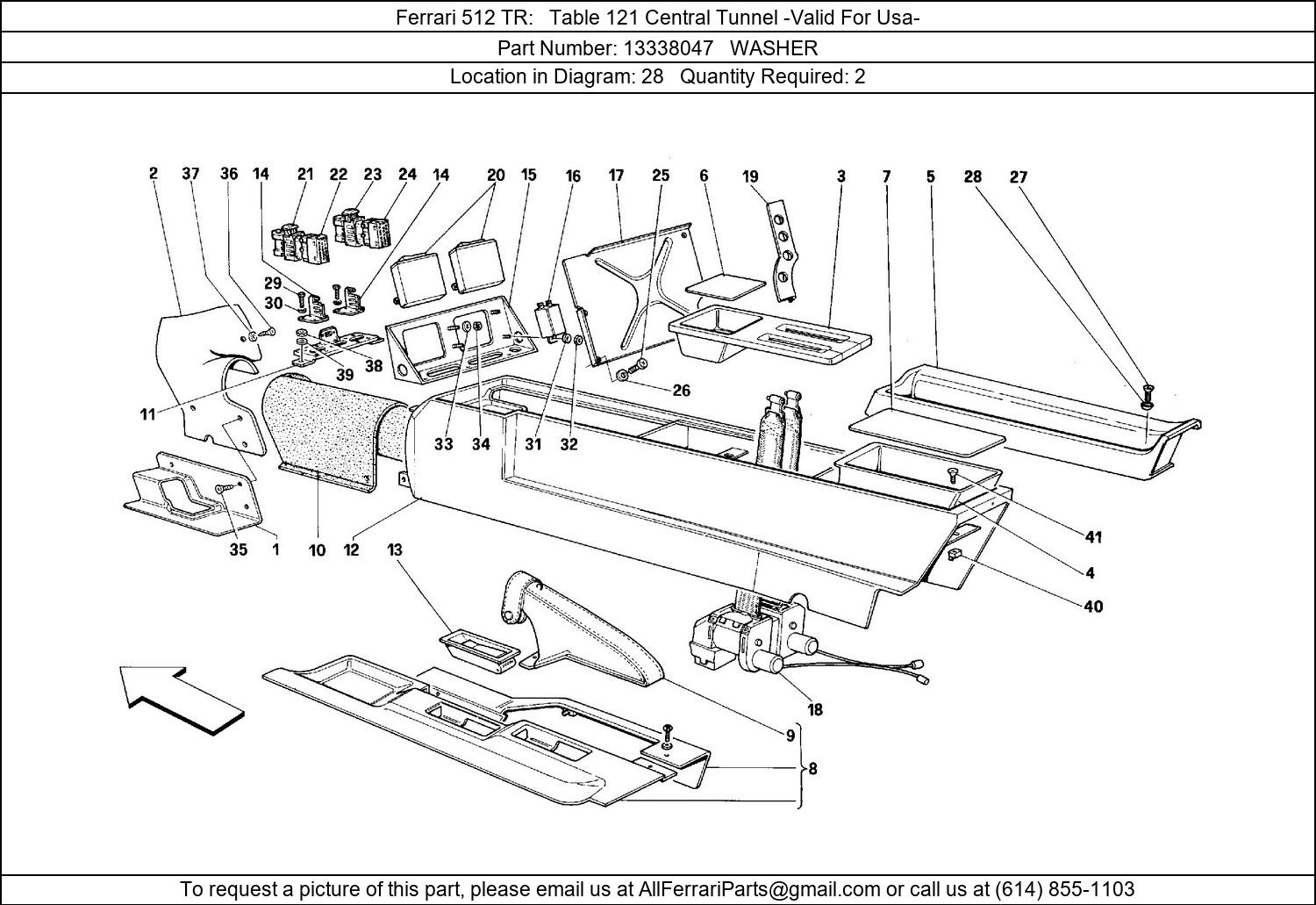 Ferrari Part 13338047, WASHER, shown here as used in Ferrari 512 TR Table 121 Central Tunnel -Valid For Usa-. Other uses of this part are shown below: