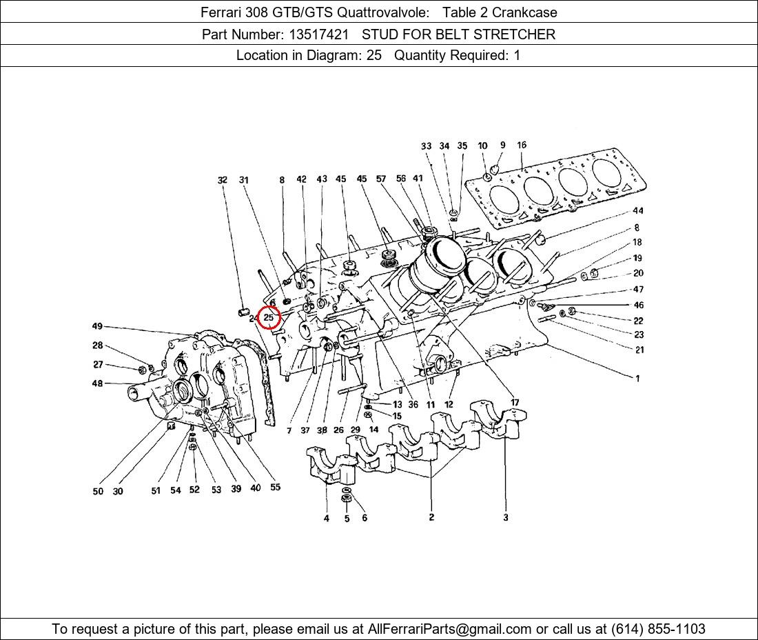 Ferrari Part Number 13517421, STUD FOR BELT STRETCHER shown here as used in Ferrari 308 GTB/GTS Quattrovalvole Table 2 Crankcase. Location in Diagram: 25. Required Quantity: 1. This Ferrari part is used in more than one diagram. Click on the diagrams below to see alternative uses of this part: