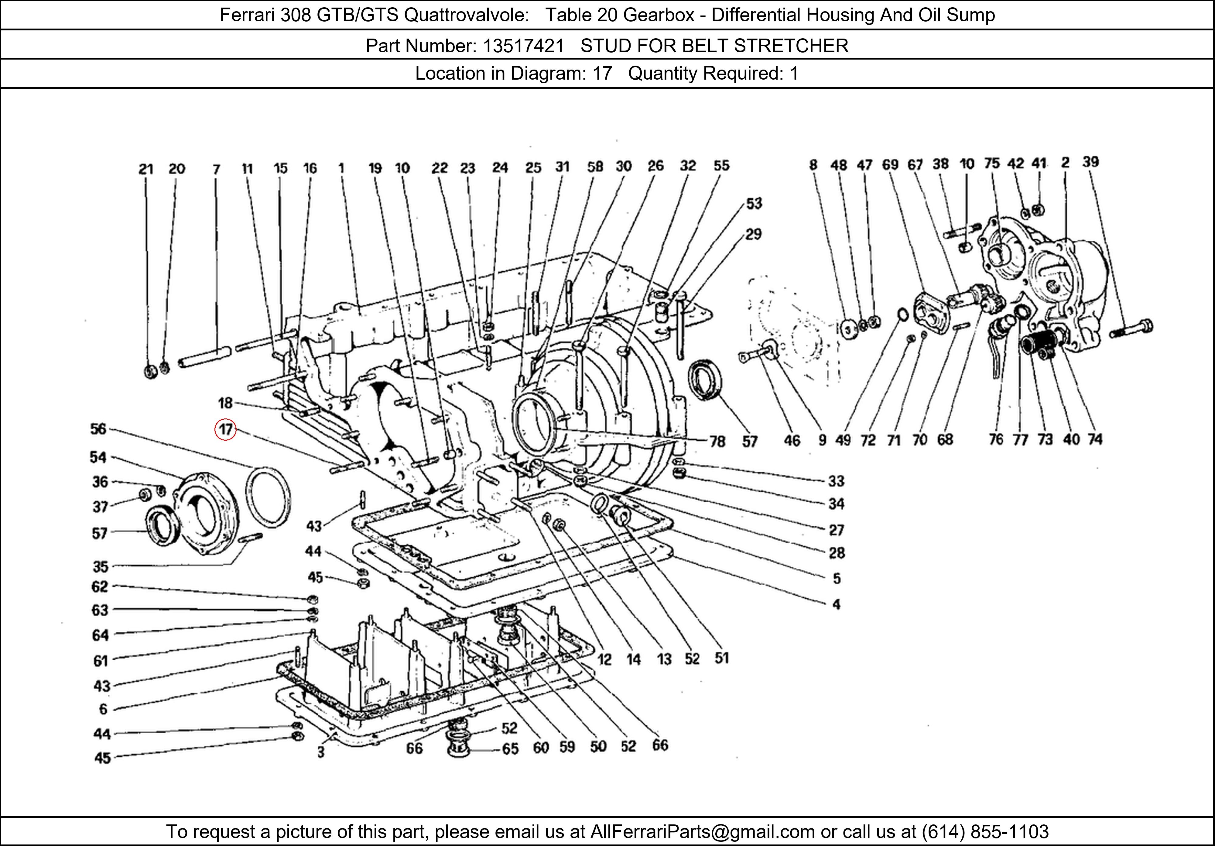 Ferrari Part Number 13517421, STUD FOR BELT STRETCHER shown here as used in Ferrari 308 GTB/GTS Quattrovalvole Table 20 Gearbox - Differential Housing And Oil Sump. Location in Diagram: 17. Required Quantity: 1. This Ferrari part is used in more than one diagram. Click on the diagrams below to see alternative uses of this part: