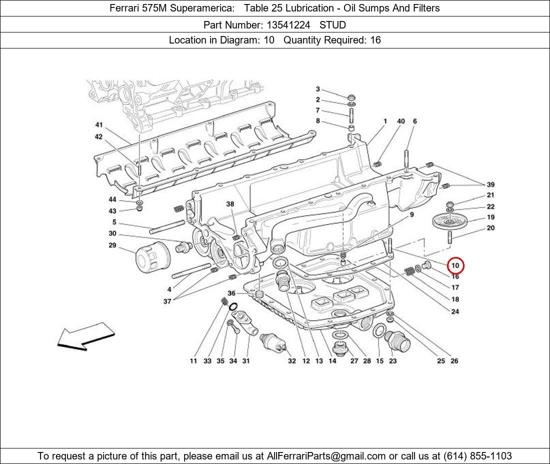 Ferrari Part Number 13541224, STUD shown here as used in Ferrari 575M Superamerica Table 25 Lubrication - Oil Sumps And Filters. Location in Diagram: 10. Required Quantity: 16. This Ferrari part is used in more than one diagram. Click on the diagrams below to see alternative uses of this part: